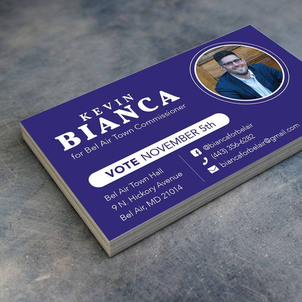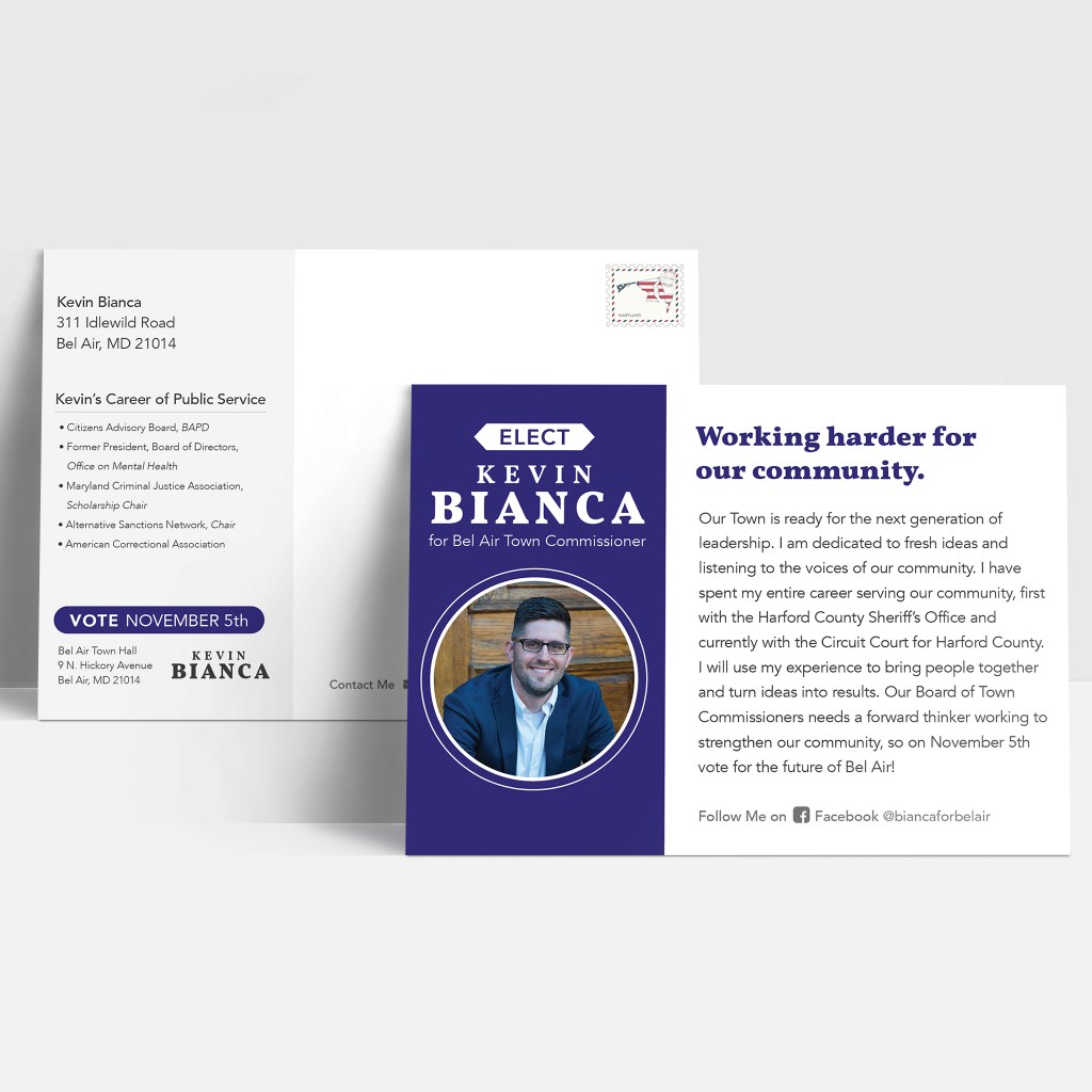 I designed a postcard and magnet to promote Kevin Bianca and his campaign to become Bel Air Town Commissioner in Harford County, Maryland. We collaborated closely and comfortably settled on the designs below. Copy was provided by Mr. Bianca and the layout of typography and graphics was done by myself in Adobe InDesign.